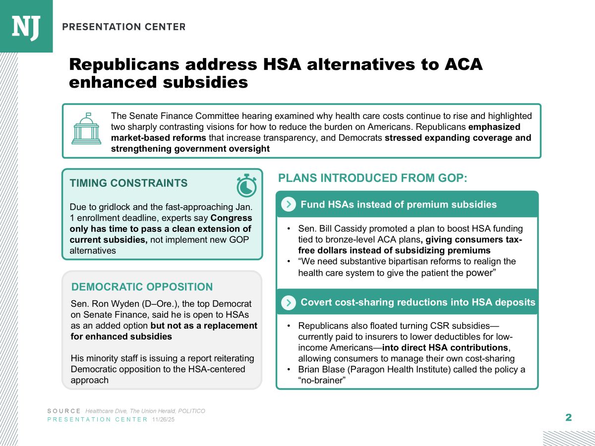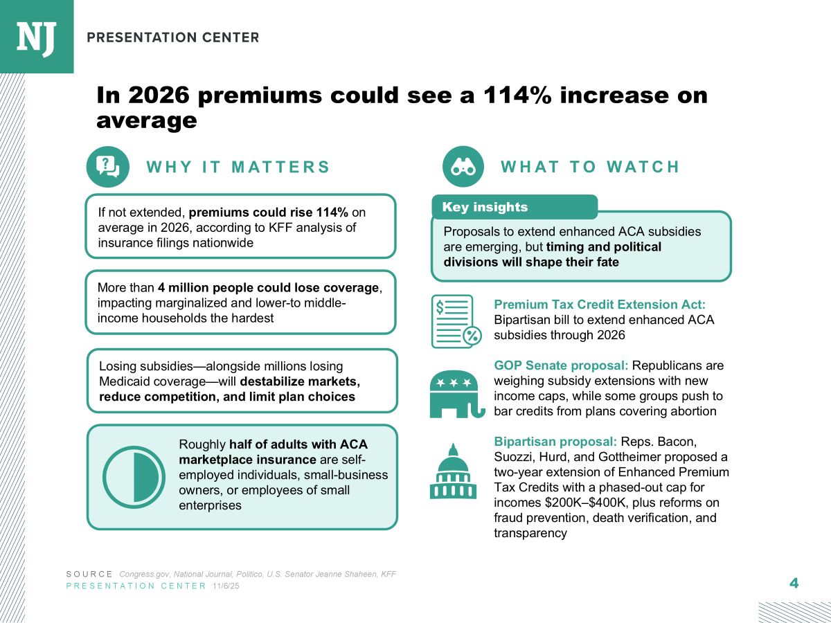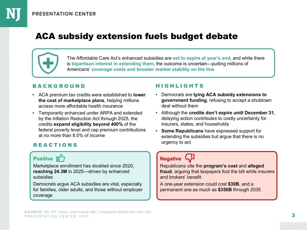 The Hill: Democrats To Force Senate Vote On 3-Year Extension Of Health Insurance Subsidies Senate Democratic Leader Chuck Schumer (N.Y.) announced Thursday that Democrats will force Republican senators to vote next week on a three-year extension of enhanced health insurance premium subsidies that are due to expire in January. Senate Majority Leader John Thune (R-S.D.) controls the Senate floor schedule but promised to let Democrats have a vote on a proposal to extend the health insurance subsidies as part of a deal with centrist Democrats to reopen the federal government after a 43-day shutdown. (Bolton, 12/4)