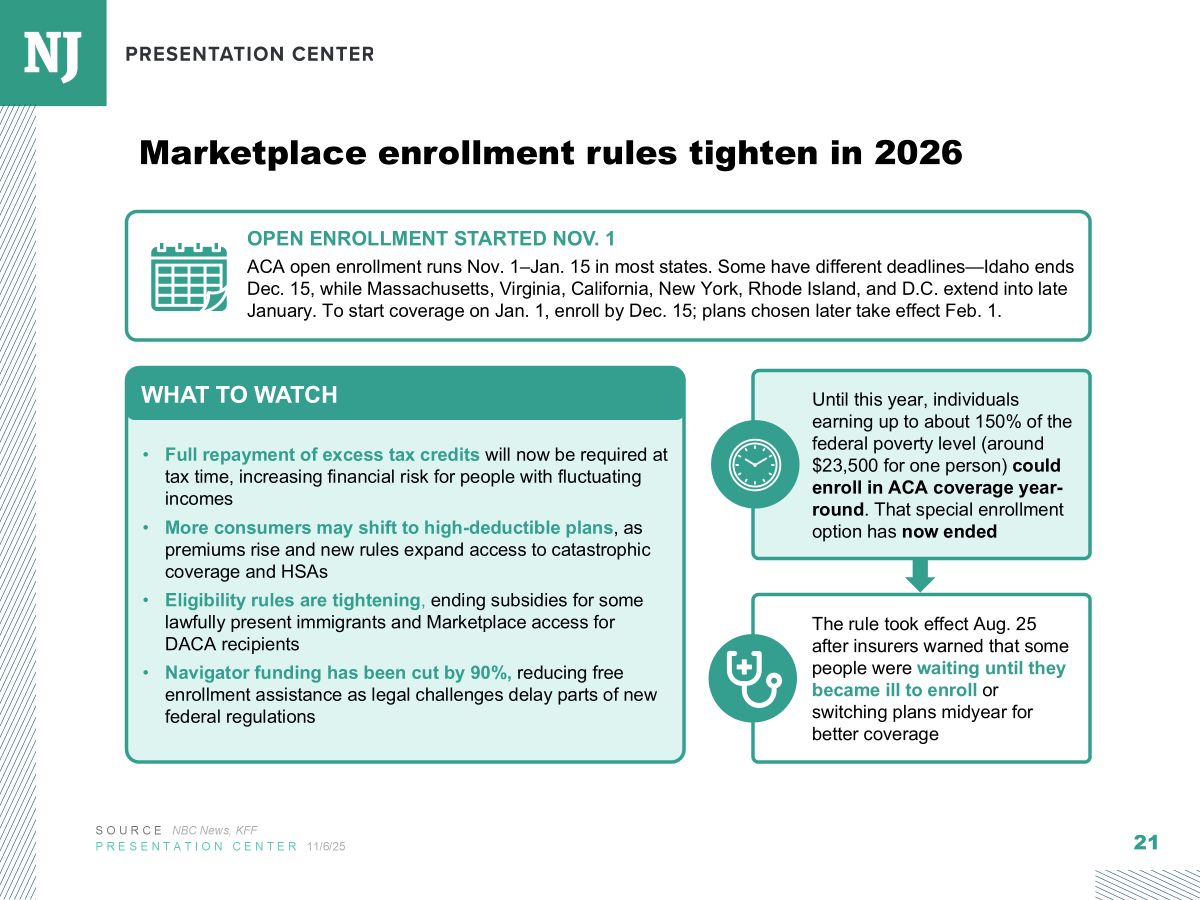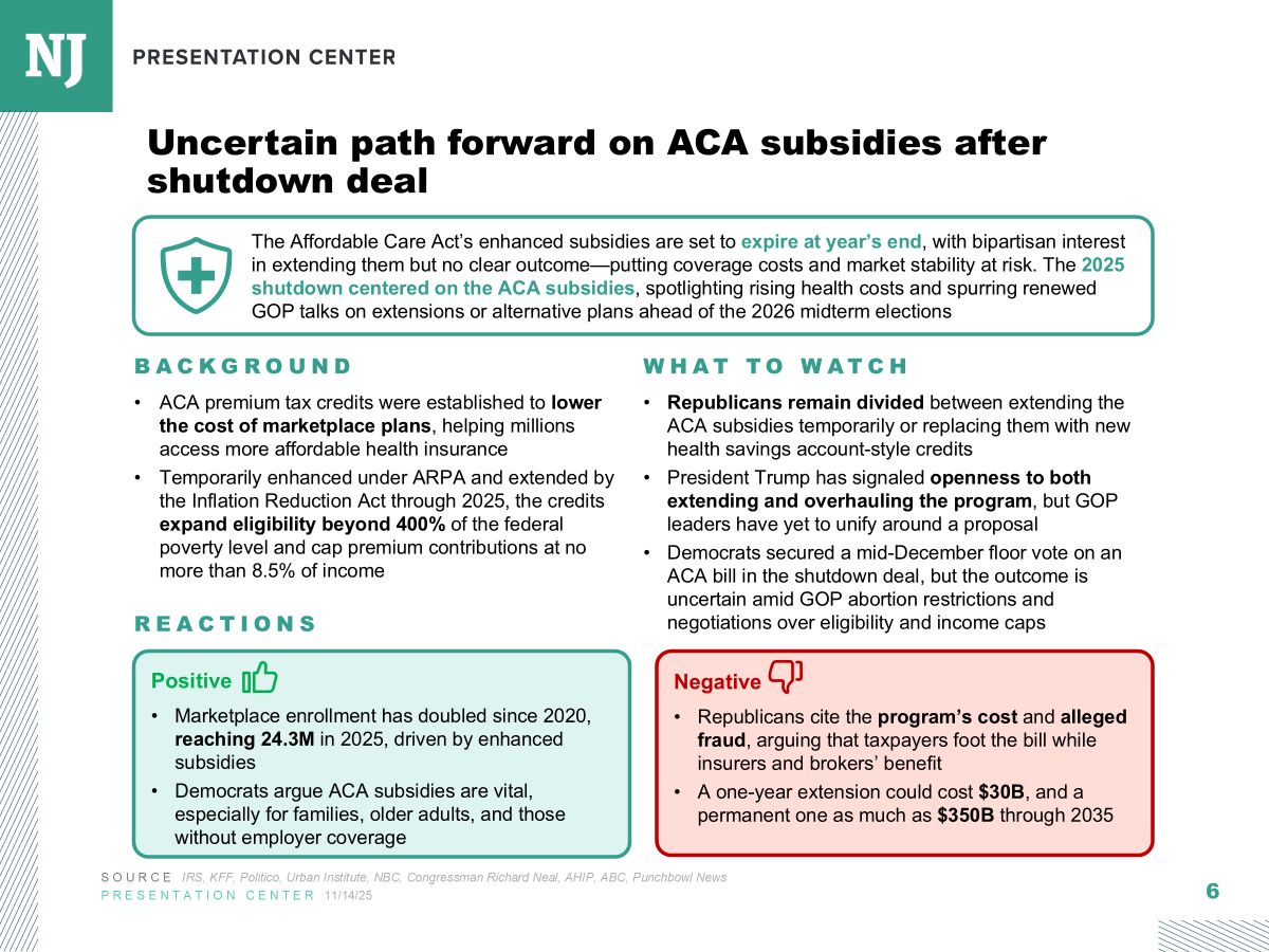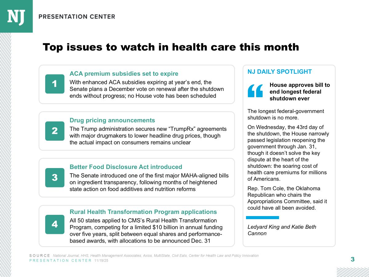 Politico: House GOP Leaders Pitch Members On Addressing ‘Unaffordable Care Act’ House Republican leaders delivered a presentation to members Tuesday morning slamming the enhanced tax credits for the Affordable Care Act that are due to expire at the end of the year. It comes as members of both parties and chambers are rushing to develop, and pass, legislation to lower health care costs by Dec. 31, when the Obamacare subsidies will expire and premiums are set to go through the roof. (Lee Hill and Guggenheim, 11/18)